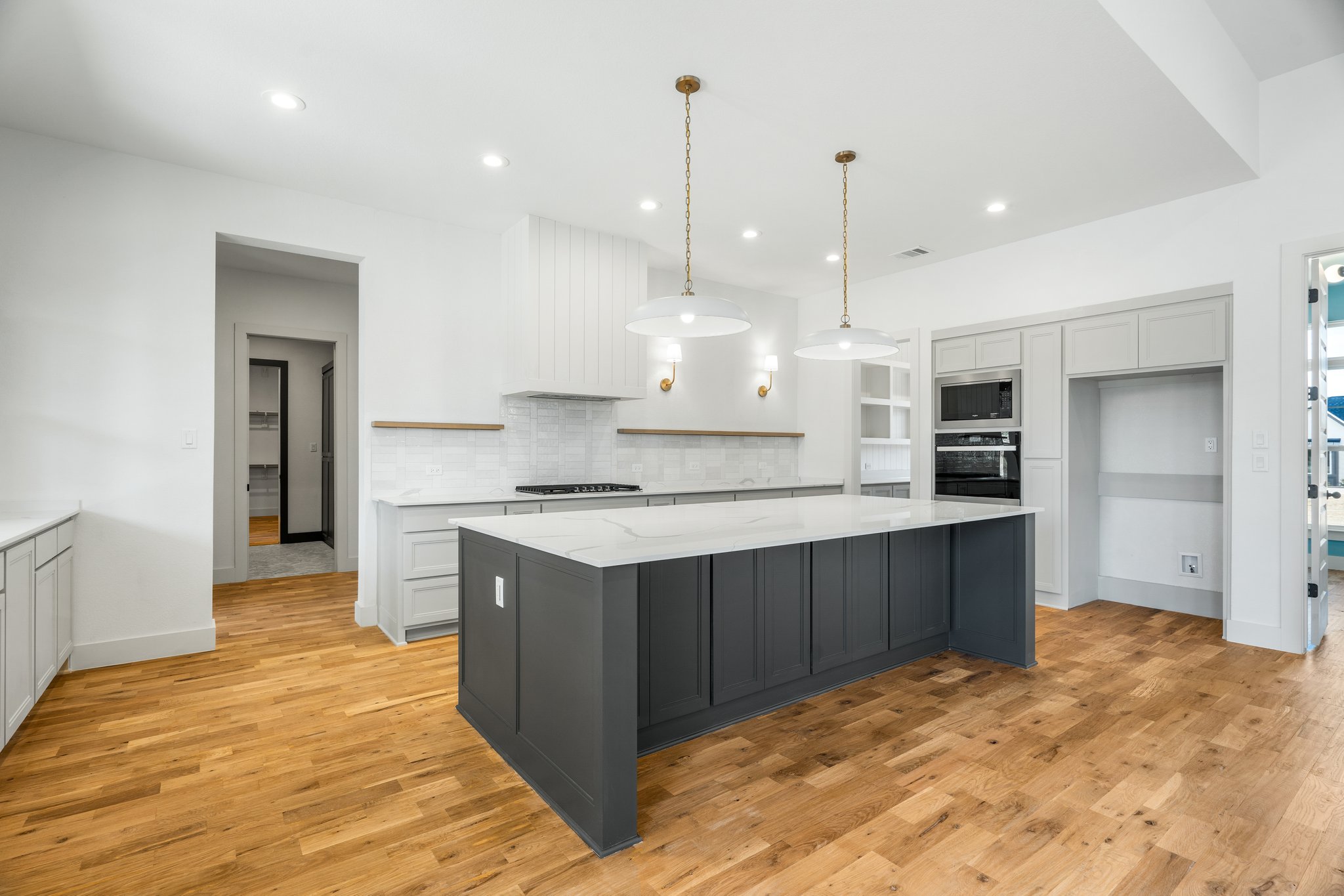 The chef-inspired kitchen is equipped with an oversized butler’s pantry, quartz countertops, a large center island, and custom cabinetry.